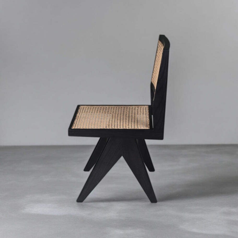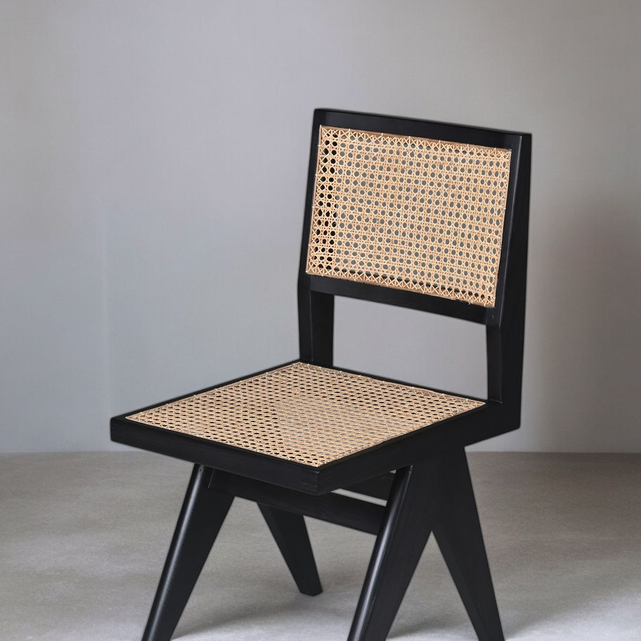 Pierre Chandigarh Chair is a stylish and compact seating option, with dimensions of L- 53 CM X D- 60 CM X H- 79 CM . Crafted from a combination of ashwood and cane, it seamlessly combines durability with a natural aesthetic. The charcoal finish highlights the wood's innate beauty, adding a touch of elegance. The Lofts Pierre Chandigarh Chair is a versatile choice, suitable for various spaces where both style and comfort are a priority.